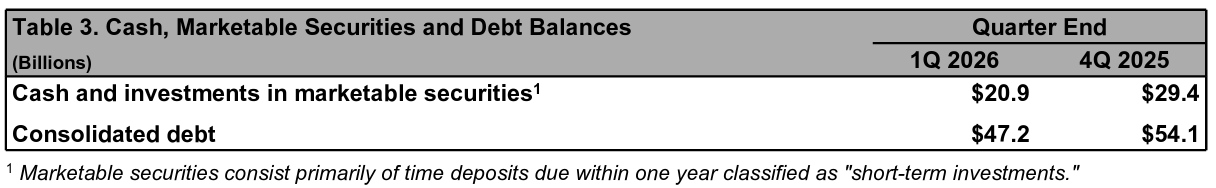 - 2026年第1四半期の総債務(Consolidated Debt)は472億ドル、前四半期から69億ドル減少
